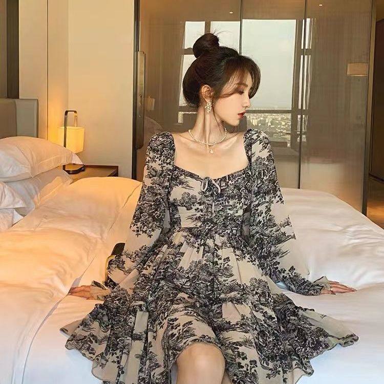 2022春秋新款雪纺超仙方领法式收腰显瘦设计感小众仙女碎花连衣裙热门设计联盟服务商